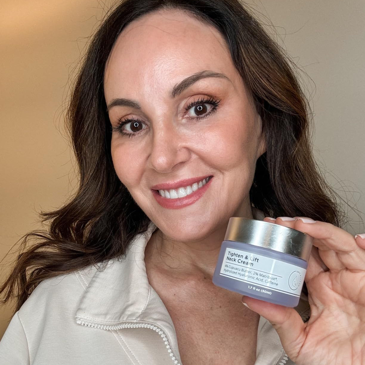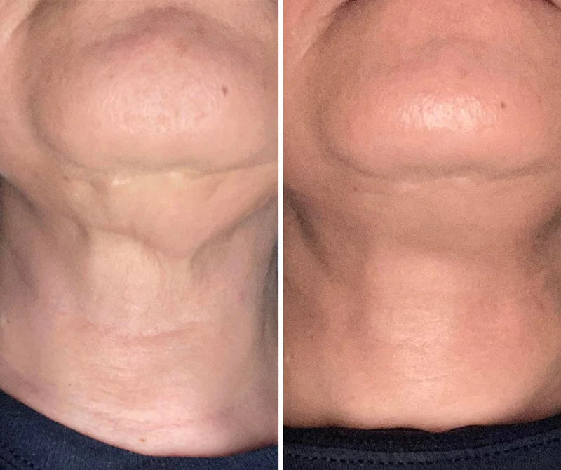 Формулата видимо повдига и стяга кожата на шията и деколтето – без нужда от процедури.